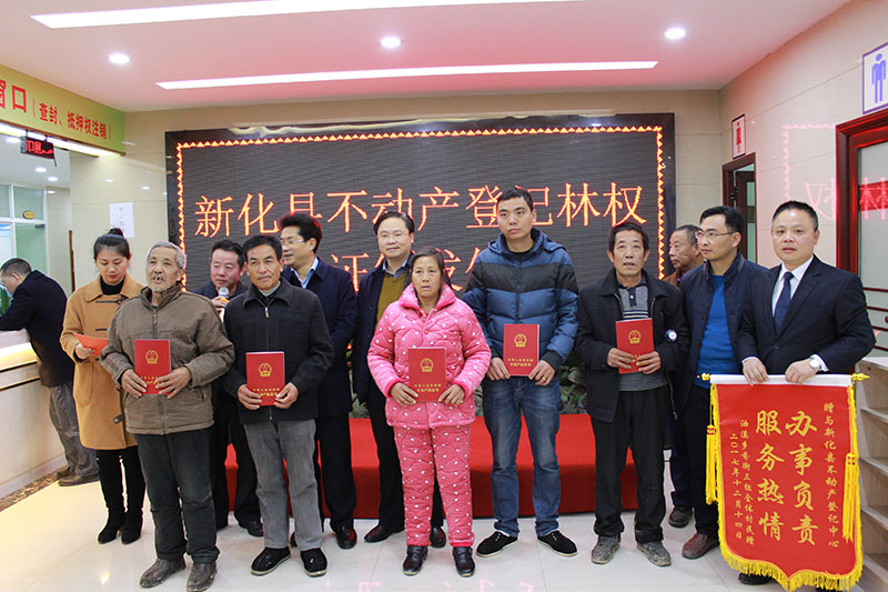12月14日上午,新化县林权首证颁发仪式在不动产登记中心举行,油溪乡芬街村的18户村民获得首批林权不动产权证。颁证仪式由县政府办副主任陈扬文主持,县林业局党组书记、局长苏传佑,县国土资源局党组书记、局长邹谊翔及分管领导、相关股室负责人颁发了不动产林权首证,县人民政府副县长赵谭华出席并作讲话。
